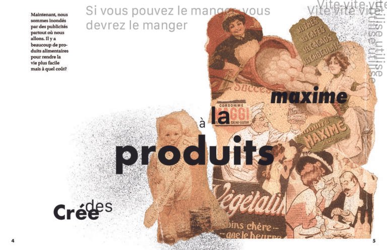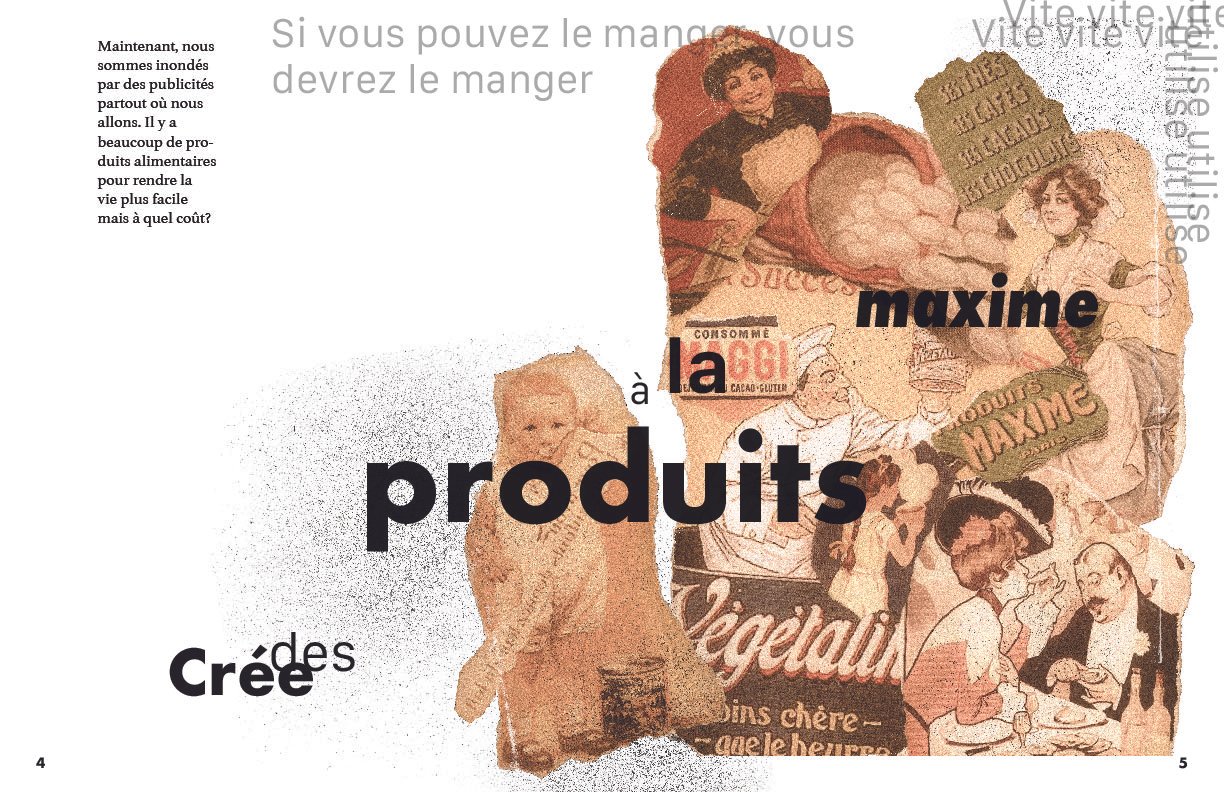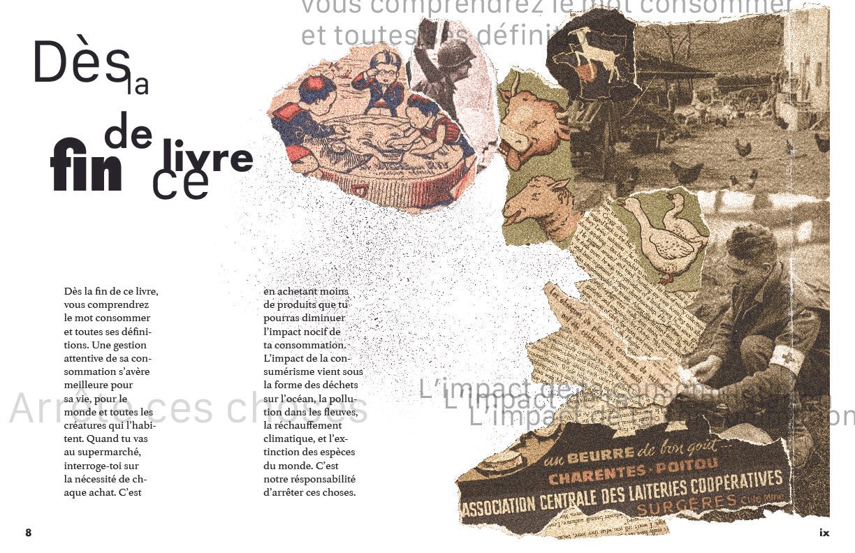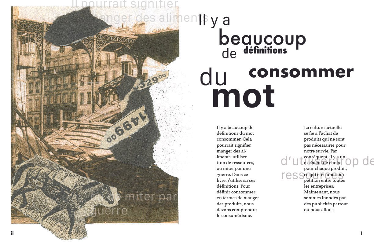 The entire book is crafted in French, highlighting my bilingual proficiency and offering a unique, non-American perspective on these themes. Emphasizing authenticity, I intentionally avoided preliminary sketches, allowing typography to naturally evolve as both an informative and artistic element.
